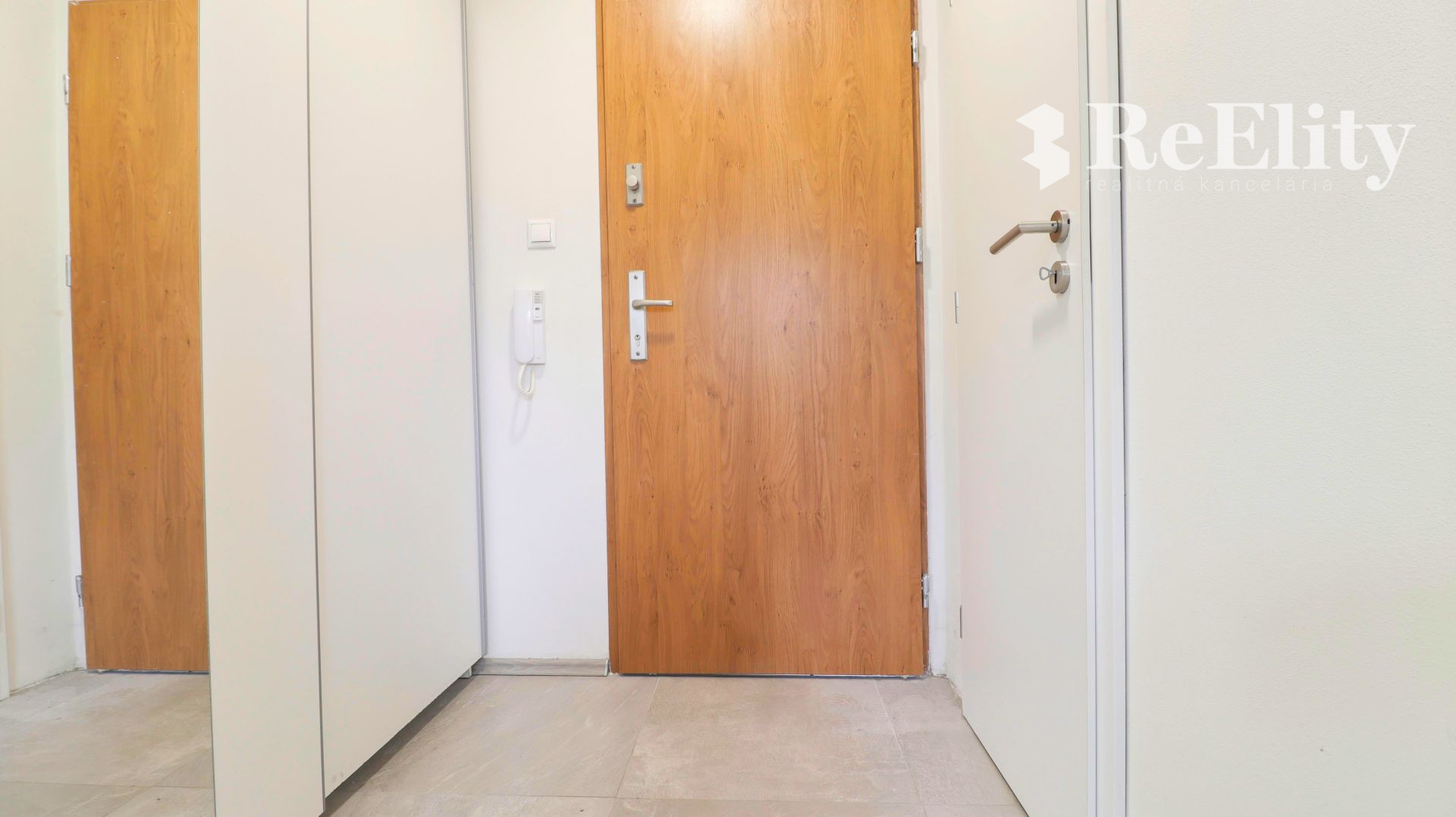 Vo vstupnej chodbe sa nachádza vstavaná skriňa, čo zvyšuje komfort vďaka odkladaciemu priestoru. Zo vstupnej chodby sa prechádza dverami do obývačky spojenej s kuchyňou, z ktorej je východ na balkón. Ďalej vstupnou chodbou je možné prejsť do kúpeľne spojenej s toaletou.