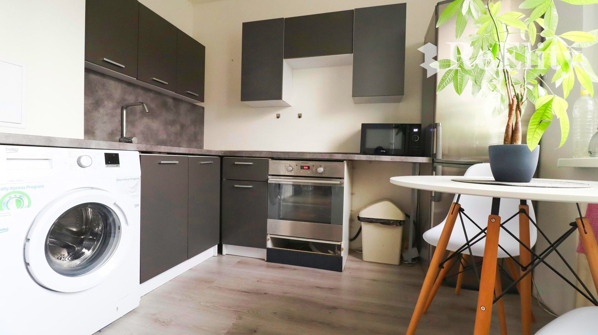 Je zariadený vrátane spotrebičov ako chladnička, rúra, práčka, televízor.